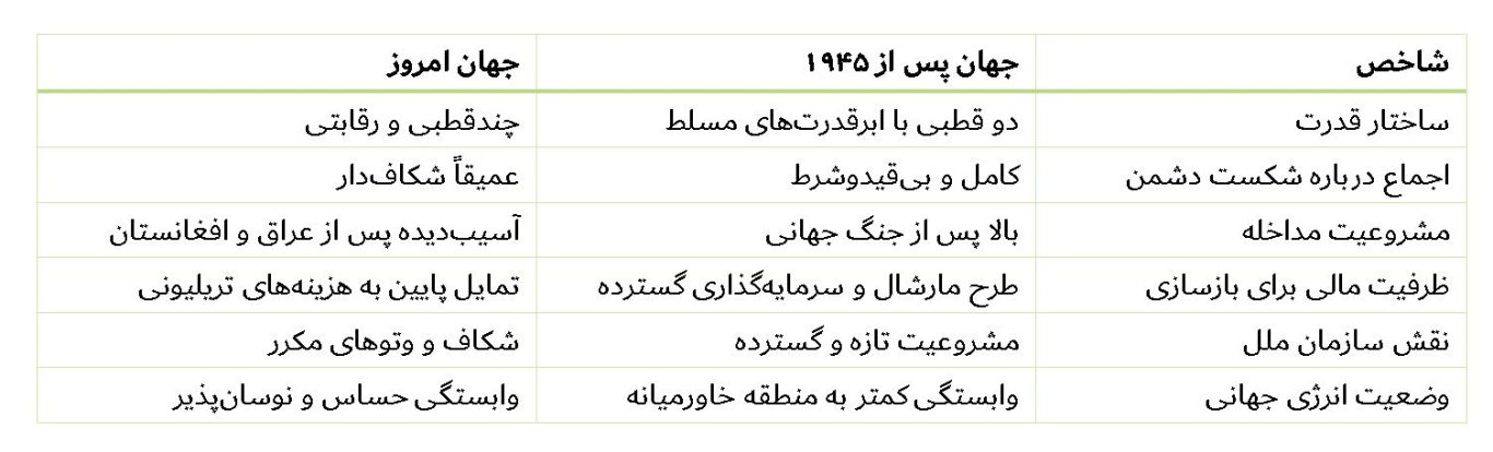مقایسه با آلمان و ژاپن فقط به این دلیل مشکلدار نیست که شرایط داخلی آن کشورها خاص بود؛ بلکه به این دلیل هم هست که جهان ۱۹۴۵ دیگر وجود ندارد. هر پروژه بازسازی پس از جنگ، نه فقط محصول وضعیت کشور هدف، بلکه محصول ساختار نظام بینالملل است. اگر آن ساختار تغییر کرده باشد، امکان تکرار آن تجربه نیز تغییر میکند.