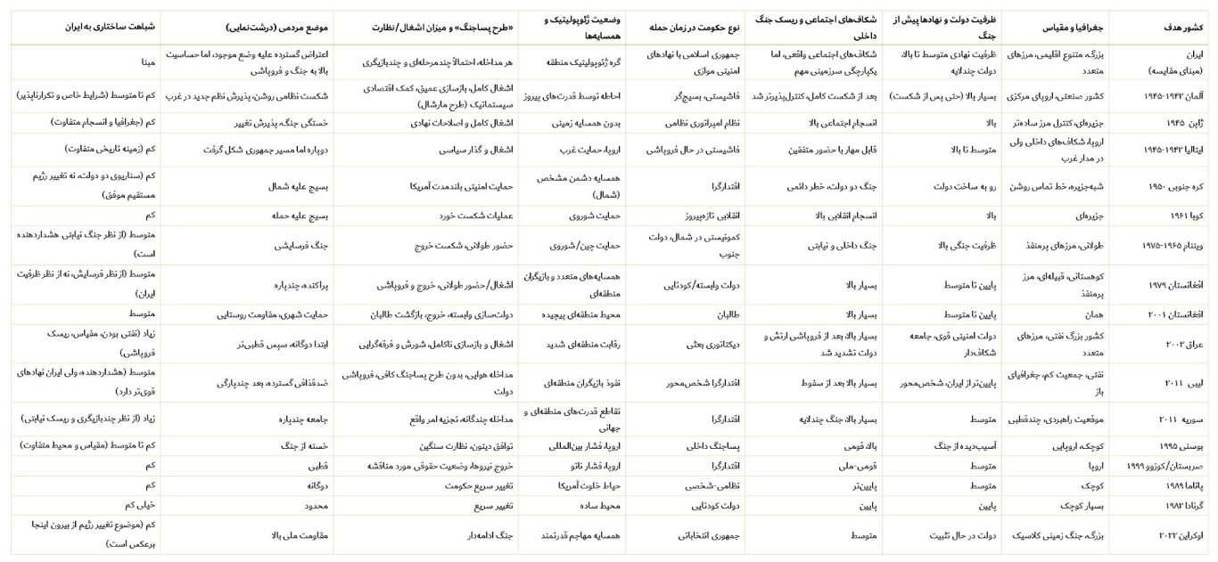 مواردی وجود دارند که در طولانی مدت نتایج مثبتی داشته اند که از وضعیت قبلی خیلی بهتر بودهاند، مثل آلمان (البته فقط آلمان غربی)، ژاپن، پاناما و گرانادا. در مقابل، مداخلاتی مانند عراق، افغانستان و لیبی نشان دادهاند که سقوط حکومت لزوماً به ثبات پایدار نمیانجامد، بلکه میتواند خلأ قدرت و بیثباتی مزمن ایجاد کند. خیلی زیاد میشنوم که ایران افغانستان یا عراق یا سوریه نیست. که البته گزاره درستی است، ولی مساله این است که ایران آلمان غربی یا ژاپن هم نیست. سوال مهم این است که ایران از نظر ساختاری به کدام گروه نزدیکتر است. ایران کشوری با جمعیت بالا، وسعت جغرافیایی گسترده، مرزهای متعدد و موقعیت ژئوپولیتیک پیچیده است. برای همین تصمیم گرفتم ایران را با کشورهای تحت حمله در جدول بالا مقایسه کنم. برای اینکه مقایسه دقیق باشد، شش شاخص کلیدی را مبنا گرفتم: وسعت جغرافیایی و جمعیت، پیچیدگی اجتماعی و شکافهای درونی، ظرفیت نهادی و ساختار امنیتی، موقعیت ژئوپولیتیک و تعداد بازیگران منطقهای، وجود یا عدم وجود «طرح بازسازی» معتبر و تضمینشده، تجربه تاریخی منطقهای از مداخله خارجی