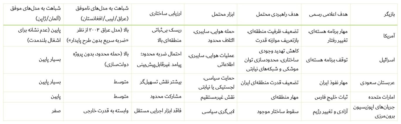 در مقابل ایران در مقایسه با الگوهای ناموفق در مدل عراق 2003 از لحاظ: هدف گسترده، انحلال ساختار قبلی، خلأ قدرت و ورود بازیگران منطقهای؛ در مدل لیبی 2011 از لحاظ: مداخله هوایی، فقدان طرح پساجنگ، چندپارگی داخلی؛ و در مدل سوریه از لحاظ مداخله چندبازیگری، جنگ نیابتی طولانی شباهتهای غیرقابل انکاری دارد.
