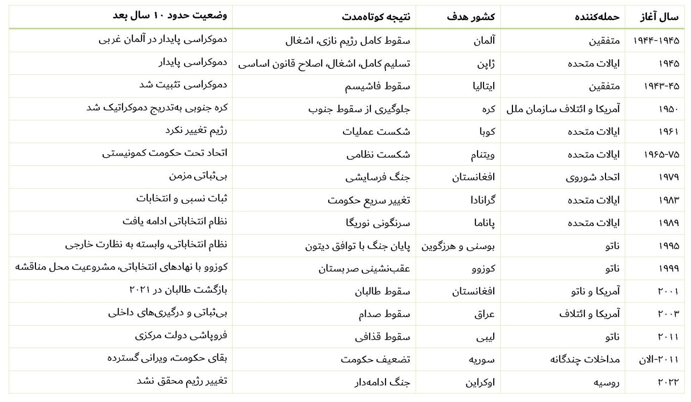 برای این کار تجربههای تاریخی تغییر رژیم از طریق مداخله نظامی در دنیای جدید یعنی بعد از جنگ جهانی دوم را بررسی کردم. این لیست تمام موارد مداخله نظامی خارجی به منظور تغییر حکومت از سال ۱۹۴۵ است: ه